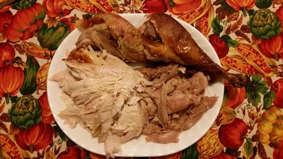 Roasted Turkey - simply and plainly, in the oven. Gravy made grandma's way with a mixture of water and flour whisked into the drippings of the turkey.